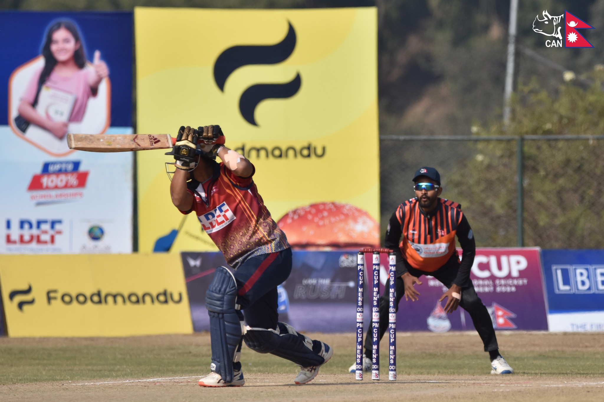 पहिलो विकेटको रुपमा ओपनर विराट भण्डारी १ रन बनाएर आउट भएका थिए । त्यसपछि कप्तान सुशान्त थापाले पनि ६ रनको मात्रै योगदान गरे ।