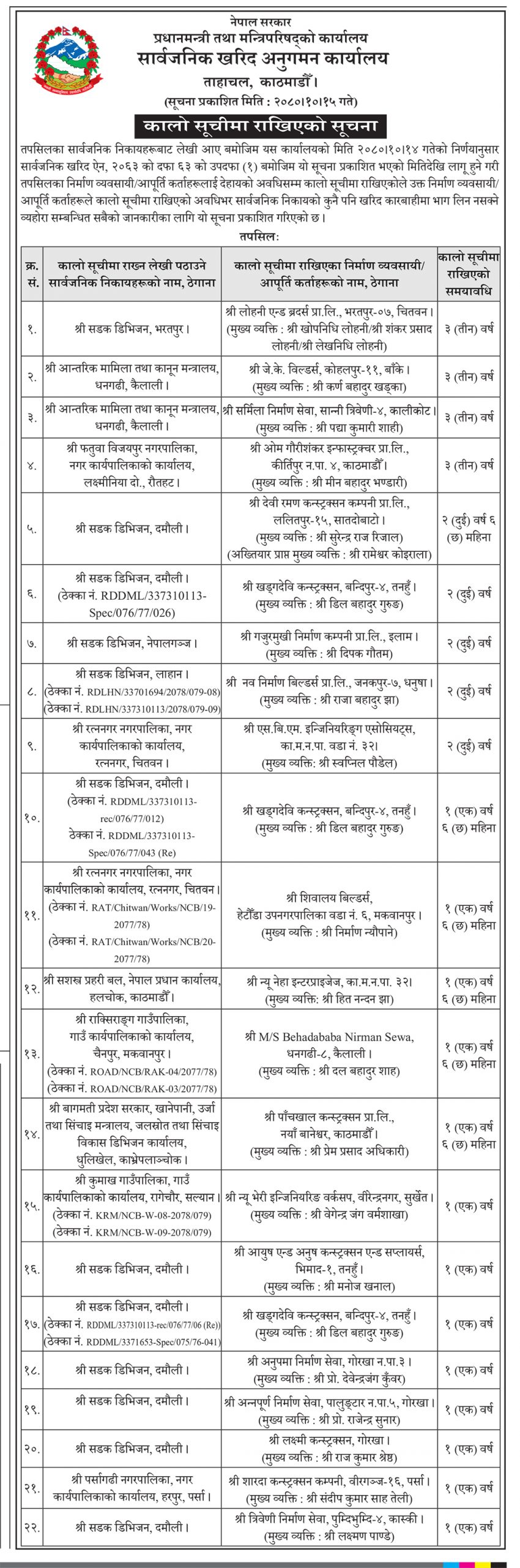 सोमबार एक सूचना प्रकाशित गर्दै आजकै मितिदेखि लागु हुनेगरी ति २२ वटा कम्पनीलाई कालोसूचीमा राखिएको हो । कालोसूचीमा राखिएको अवधिभर उक्त निर्माण व्यवसायी तथा आपूर्तिकर्ताहरूले सार्वजनिक निकायको कुनै पनि खरिद कारबाहीमा भाग लिन पाउने छैनन् ।