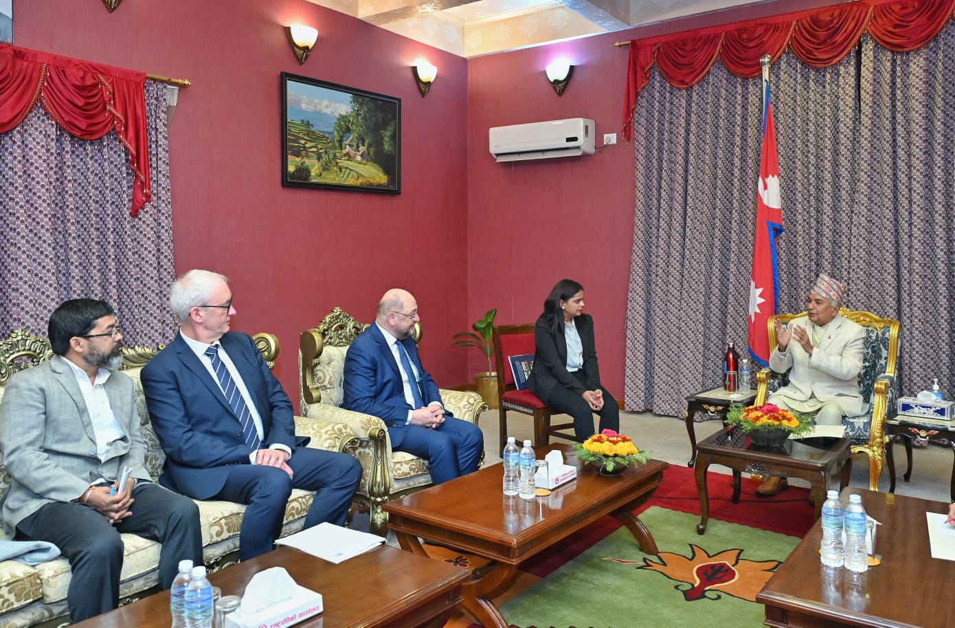 काठमाडौं । राष्ट्रपति रामचन्द्र पौडेलसँग सोसल डेमोक्रयाटिक पार्टी अफ जर्मनी (एसपीडी) का पूर्वअध्यक्ष तथा फ्रेडरिक एबर्ट स्टिफ्टुङ (एफइएस) का अध्यक्ष डा.मार्टिन शुल्जले शिष्टाचार भेटवार्ता गरेका छन् ।