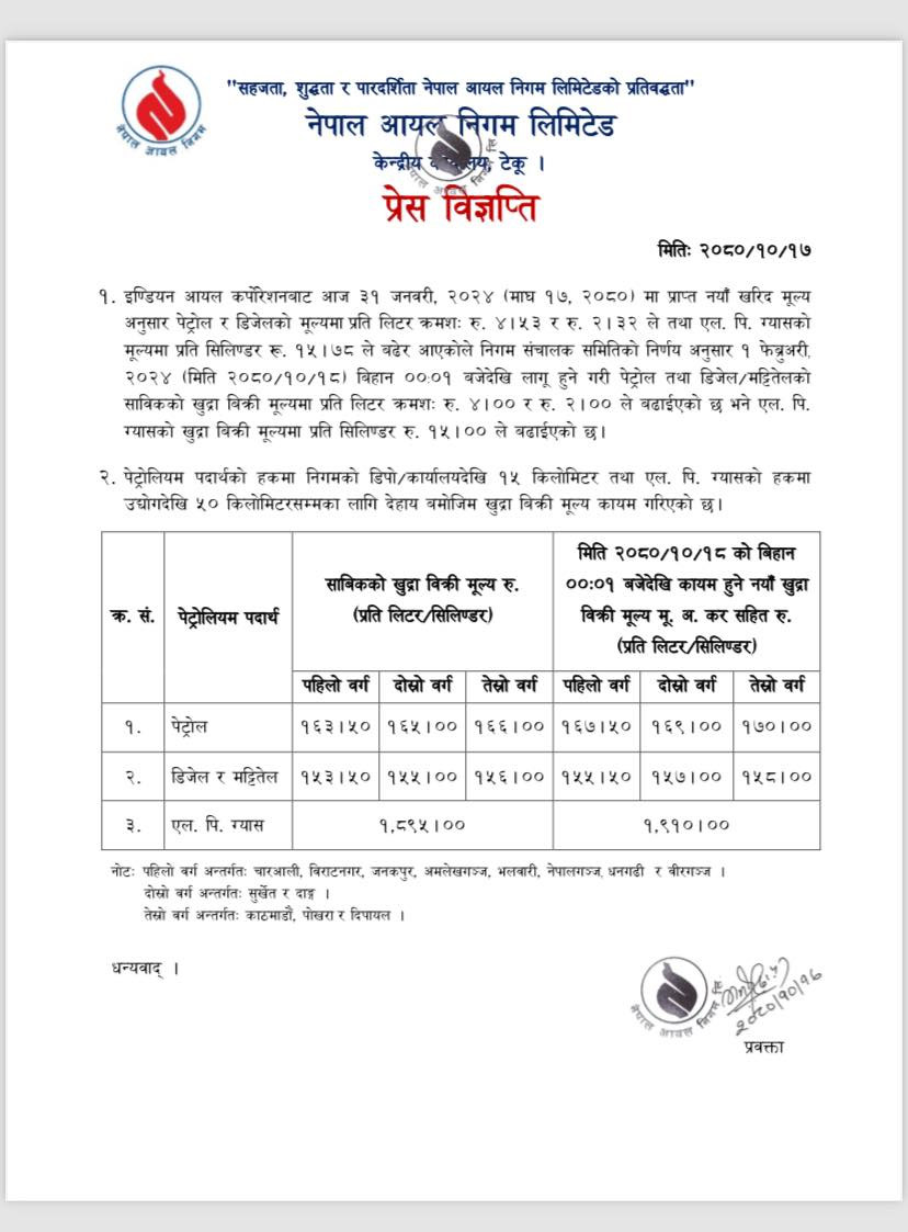 निगमका अनुसार बढेको मूल्य बुधबार मध्यरातिदेखि नै लागू भएको छ ।