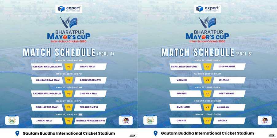 भरतपुर । भरतपुर मेयर्स कप अन्तरविद्यालय क्रिकेट प्रतियोगिताको नकआउट चरणको खेल तालिका सार्वजनिक भएको छ । माघ २६ गतेदेखि हुने प्रतियोगितामा सहभागी २० वटा विद्यालयलाई दुई समूहमा राखिएको छ ।