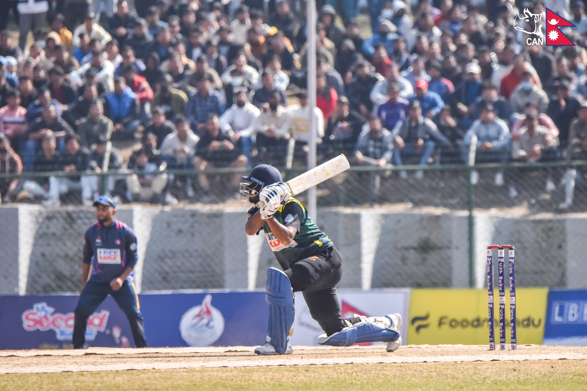 त्यस्तै, सोमपाल कामीले ३९, इमरान शेख २८, कुशल मल्ल १७ रनमा आउट हुँदा अन्य खेलाडीले दोहोरो अंकमा रन जोड्न सकेनन् ।