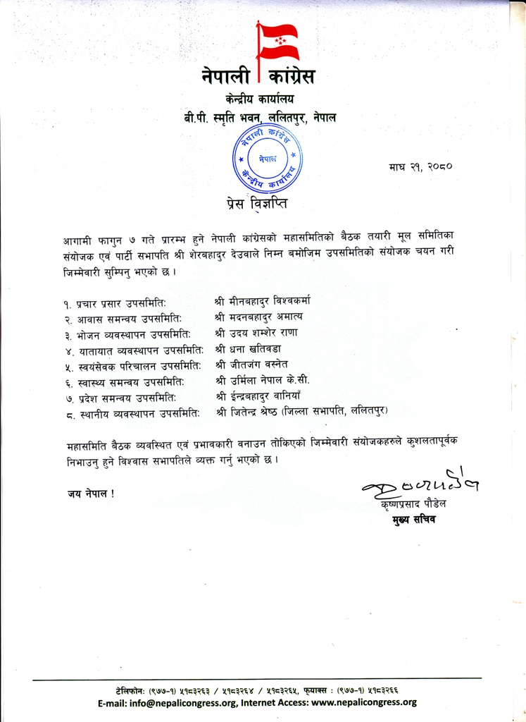 काठमाडौं । नेपाली कांग्रेसले आगामी फागुनमा हुने महासमितिको बैठक तयारी गर्न मूल समितिका विभिन्न उपसमिति संयोजकहरू चयन गरेको छ ।