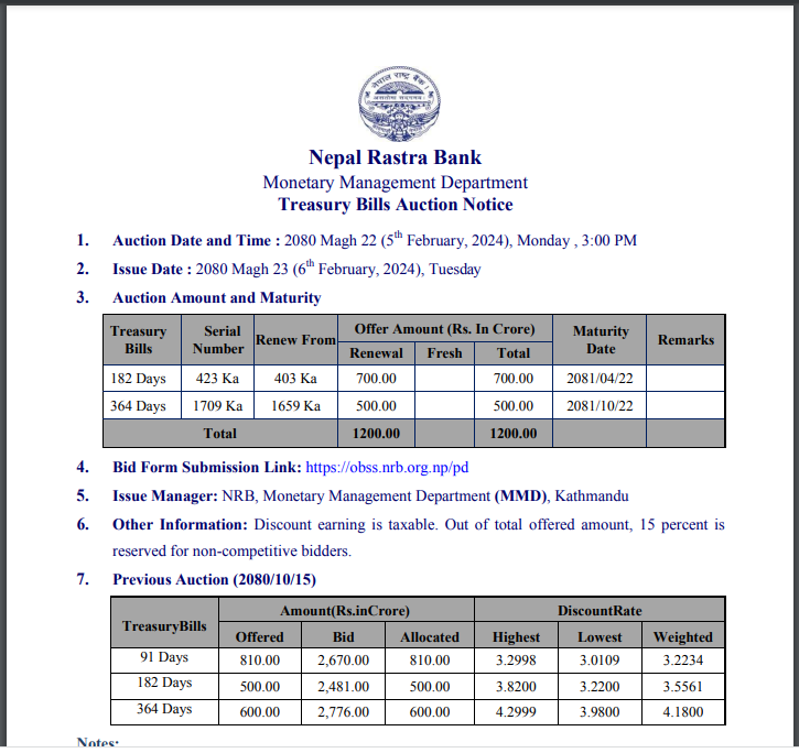 सो दिन अपरान्ह दुई बजेसम्म बोलकबोलको माध्यमद्धारा उक्त परिमाणमा ट्रेजरी बिल बिक्री गर्न लागिएको राष्ट्र बैंकले जानकारी दिएको छ ।