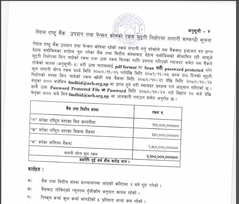 रकम लगानीको लागि प्रस्ताव पेस गर्ने बैंक तथा फाईनान्स कम्पनीहरु सञ्चालनमा आएको कम्तीमा दुई बर्ष पुरा गरेको, तोकिएको न्यूनतम पूँजीकोष कायम रहेको, निष्कृय कर्जा (एन.पी.ए) कुल कर्जा सापटको पाँच प्रतिशत भन्दा कम भएको खुद तरल सम्पत्ति स्वदेशी निक्षेपको कम्तिमा २० प्रतिशत वा सो भन्दा बढी रहेको हुनुपर्ने शर्तहरु तोकिएका छन् ।