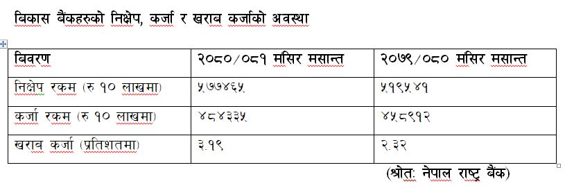 राष्ट्र बैंकका अनुसार यस अवधिमा विकास बैंकहरुको कुल निक्षेप रकम भने पाँच खर्ब ७७ अर्ब ४६ करोड ५० लाख रुपैंयाँ रहेको छ । यस अवधिमा विकास बैंकहरुमा खराब कर्जाको अनुपात भने बढेर ३.१९ प्रतिशत पुगेको छ । यो खराब कर्जा गत आवको सोही अवधिको तुलनामा शुन्य दशमलव ८७ प्रतिशतले बढी हो ।