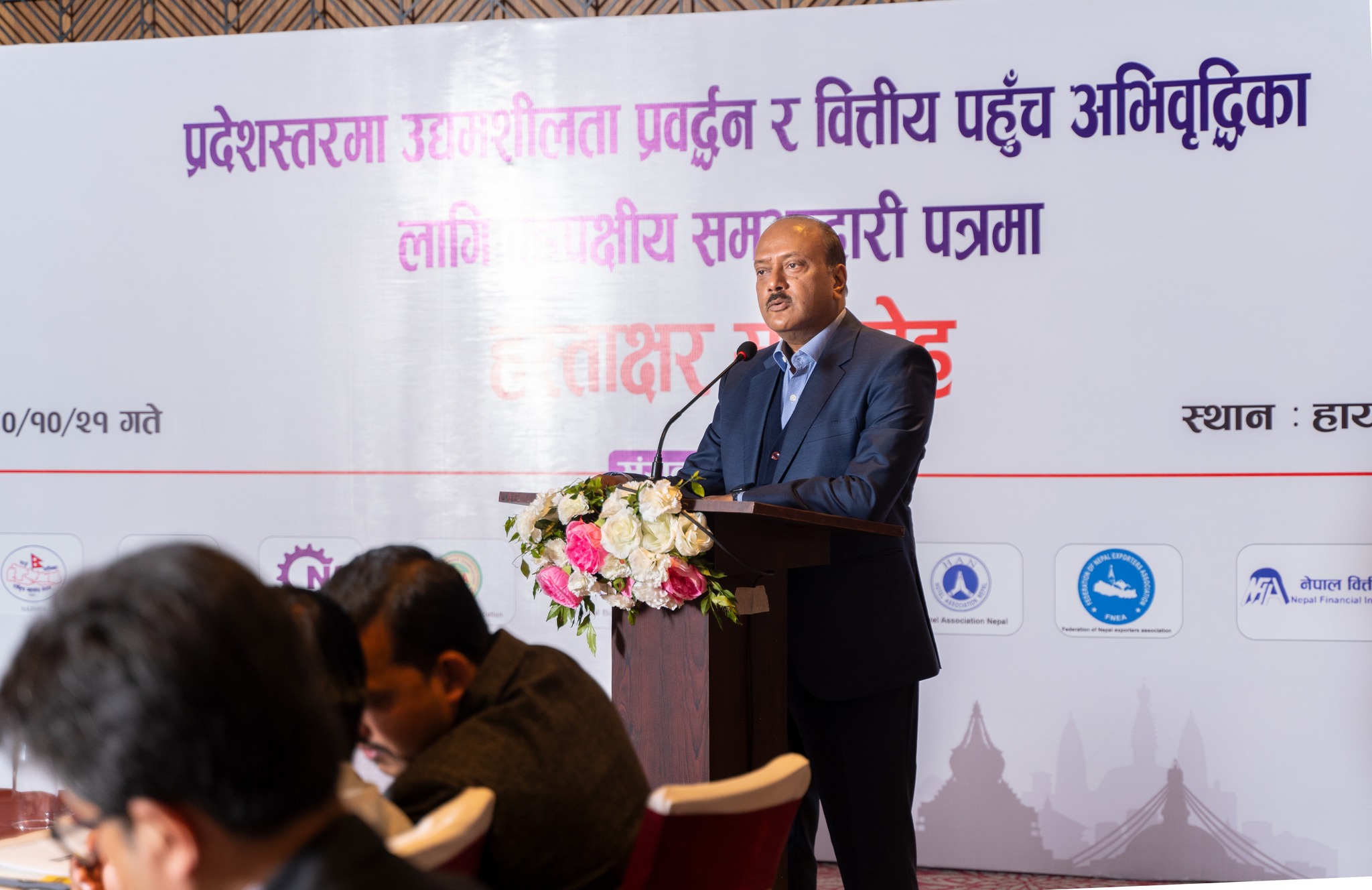 हस्ताक्षर कार्यक्रममा बोल्दै योजना आयोगका सदस्य डा. रमेशचन्द्र पौडेलले देशको आर्थिक विकासका लागि सरकार र निजी क्षेत्र मिलेर अघि बढ्नुको विकल्प नभएको बताए । नेपाली मौलिक उत्पादनको आधुनिकिकरण/व्यवसायीकरण गर्न आवश्यक रहेको बताउँदै उनले गरिब, विपन्न र पिछडिएका घरपरिवारहरुको वित्तीय पहुँच बढाउन र गाउँगाउँमा आर्थिक गतिविधिहरुलाई बढवा दिन यस्ता कार्यक्रमले टेवा पु¥याउने विश्वास व्यक्त गर्दै योजना आयोगको सदैव साथ र सहयोग रहने बताए ।