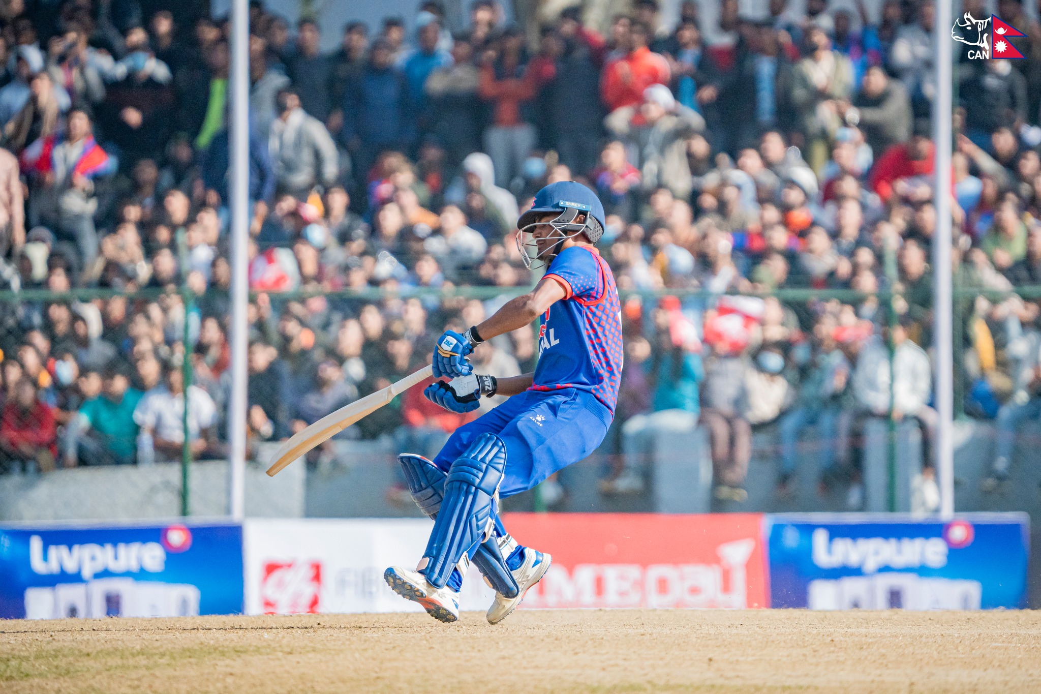 १०१ बल खेलेका उनले ८ चौका र ४ छक्काको मद्दतमा ८७ रन बनाउदै आउट भएका हुन् । यो सँगै नेपालले ५ विकेट गुमाएको छ । यसअघि भीम सार्की २३ रनमा आउट भएका थिए ।