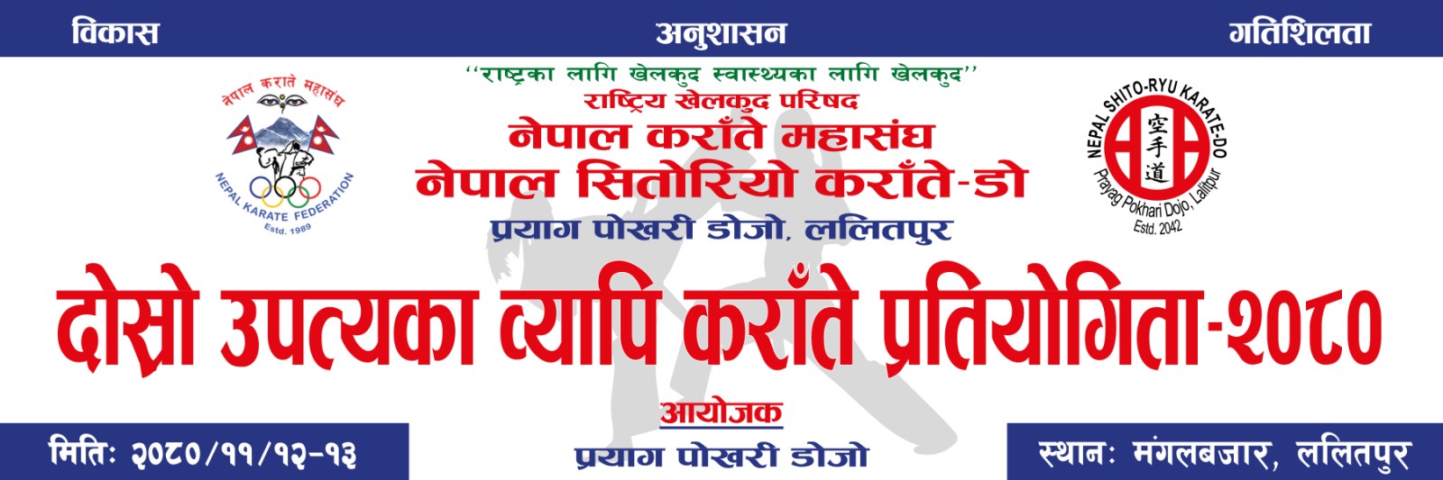 प्रयागपोखरी डोजोका आयोजनामा ललितपुरमा आजदेखि सुरु हुने प्रतियोगितामा पुरुष÷महिलाको एकल कातासहित समान १०–१० गरी २० स्पर्धामा प्रतिस्पर्धा हुने आयोजक डोजोका प्रशिक्षक विकास महर्जनले जानकारी दिए ।