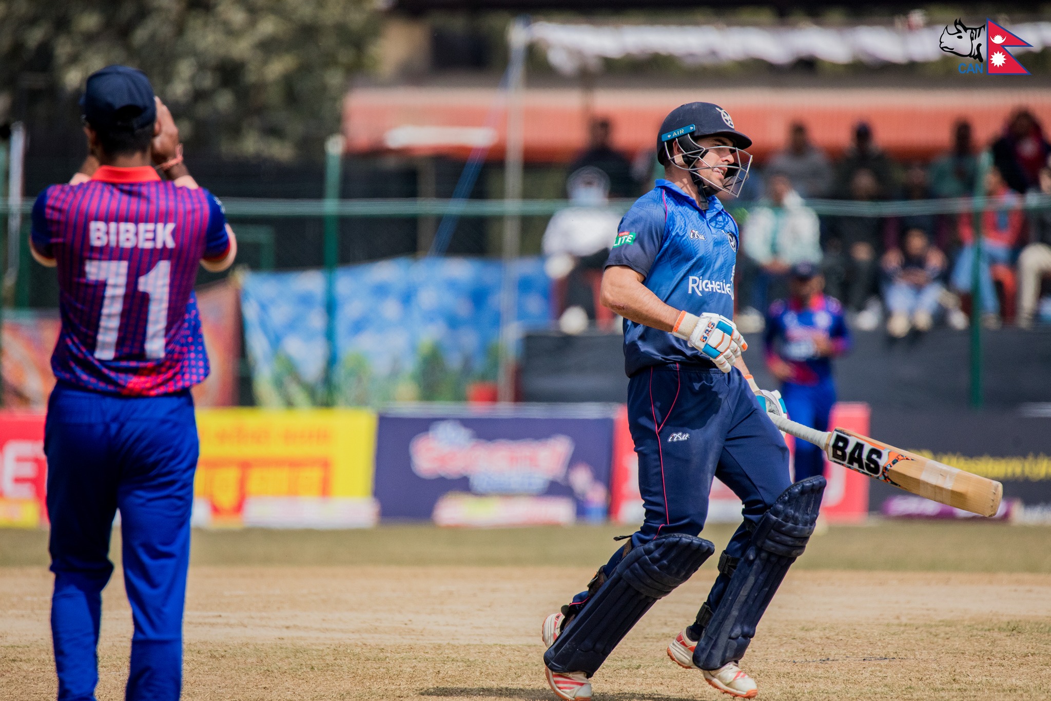 नेपालका कप्तान रोहित पौडेलले दुई विकेट लिँदा करण केसी र अविनाश बोहराले समान एक–एक विकेट लिए ।