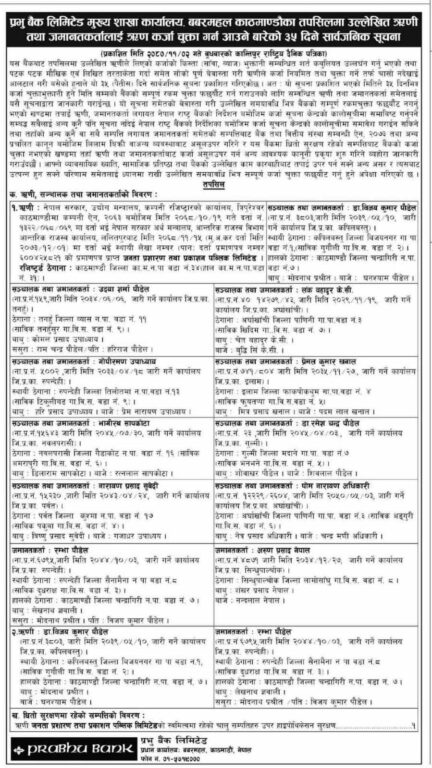 बैंकले आज एक सार्वजनिक सूचना जारी गर्दै ३५ दिनभित्र सम्पर्कमा आउन नभए कानुनी प्रक्रियामा जाने समेत चेतावनी दिएको हो ।
