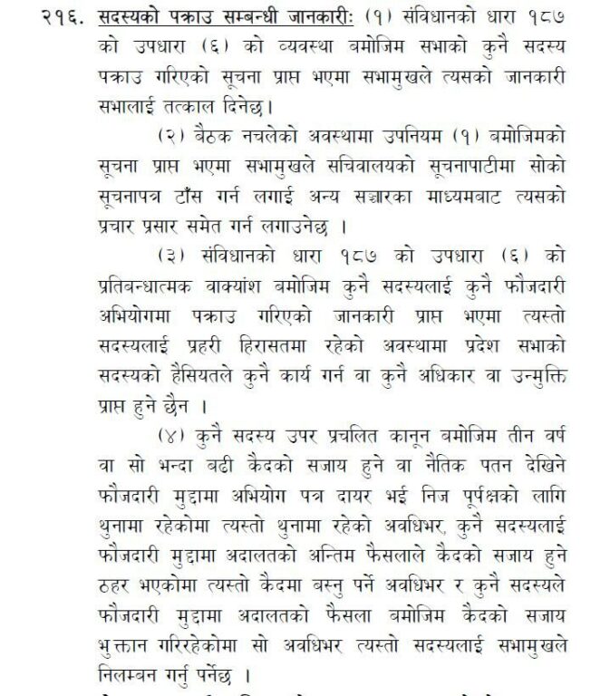 त्यसरी सूचना प्राप्त भएपछि प्रदेश सभाका सभामुखले प्रदेश सभा चलिरहेको समयमा भएमा सभालाई र सभा नचलिरहेको अवस्थामा सचिवालयको सूचना पाटीमा सूचना टाँस गर्नुपर्ने उल्लेख छ ।