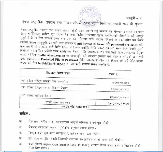 लगानी गरिने कुल रकम मध्ये पेन्सन तथा उपदान कोष अन्र्तगतको १४ करोड रुपैयाँको परिपक्व हुने अवधि तीन सय ६६ दिन अर्थात बिसंं २०८० चैत्र २ गते देखि २०८१ चैत्र १ गते तोकिएको छ । रकम लगानीको लागि यही फागुन २० गते भित्र आफ्नो संस्थाले लगानी गर्न चाहेको रकम र दिन चाहेको व्याज समेत तोकेर बोलकबोल पेस गर्नु पर्ने छ ।