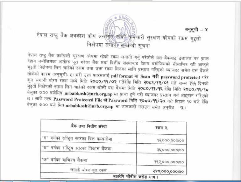 यसैगरी कर्मचारी सुरक्षण कोष अन्र्तगत भने २४ करोड रुपैयाँ लगानीको लागि छुट्याईएको छ । लगानी अवधि तीन सय ६६ दिन अर्थात २०८० चैत्र दुई गते देखि २०८१ चैत्र एक गते तोकिएको रकम लगानीको लागि फागुन २० गतेसम्म बोलकबोलव पेश गर्नुपर्ने छ ।