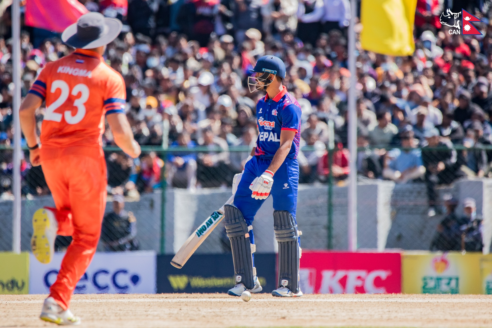 कीर्तिपुरमा जारी त्रिदेशीय सिरिजको फाइनलमा नेदरल्याण्ड्सविरुद्ध कप्तान रोहितकुमार पौडेलले टस जितेर व्याटिङ गर्ने निणर्य गरेका थिए ।