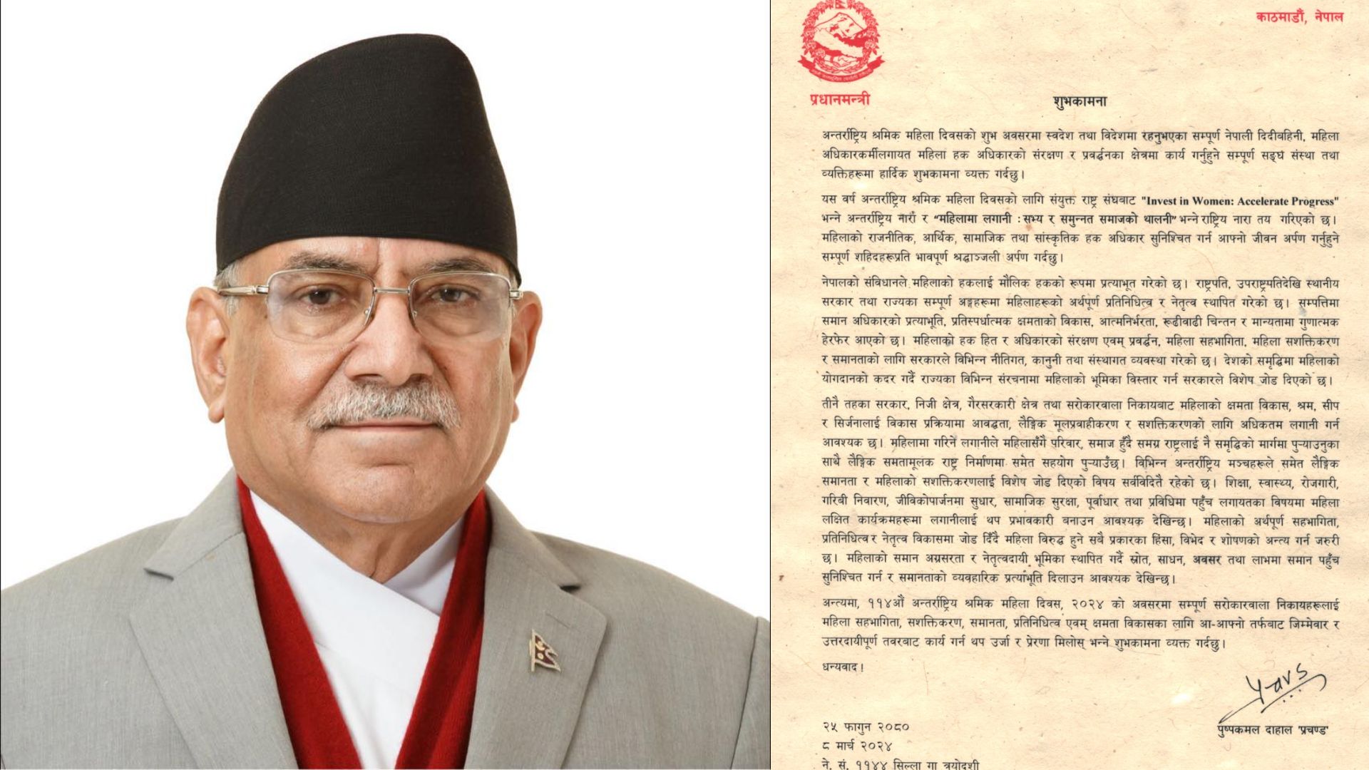 ‘नेपालको संविधानले महिलाको हकलाई मौलिक हकको रूपमा प्रत्याभूत गरेको छ । राष्ट्रपति, उपराष्ट्रपतिदेखि स्थानीय सरकार तथा राज्यका सम्पूर्ण अङ्गहरूमा महिलाहरूको अर्थपूर्ण प्रतिनिधित्व र नेतृत्व स्थापित गरेको छ,’ प्रधानमन्त्री दाहालले भनेका छन्, ‘सम्पत्तिमा समान अधिकारको प्रत्याभूति, प्रतिस्पर्धात्मक क्षमताको विकास, आत्मनिर्भरता, रूढीवाढी चिन्तन र मान्यतामा गुणात्मक हेरफेर आएको छ ।’