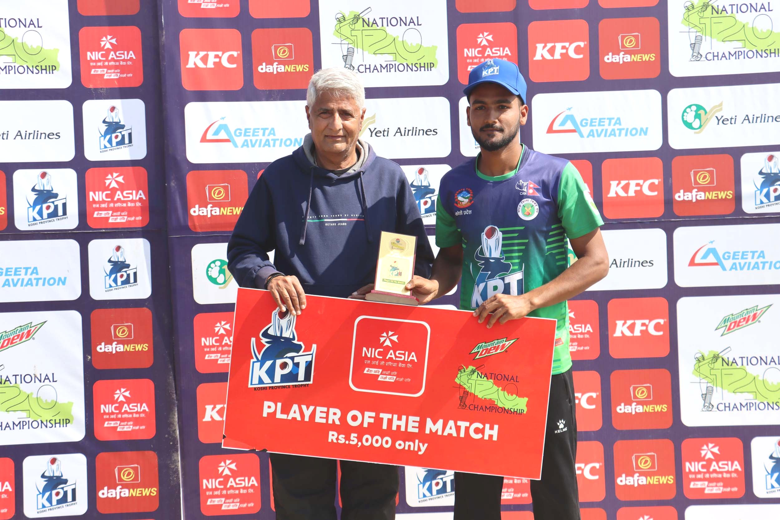आर्मीका प्लेयर अफ द म्याच वसिर अहमदले ३८ बलमा २ छक्का र २ चौका प्रहार गरि ४२ रन बनाए । यस्तै,सन्दिप रजालीले नटआउट ४१ रन र सन्तोष कार्कीले ३४ रनको योगदान दिए । कर्णालीका प्रकाश जैशीले २ विकेट लिँदा दिनेश अधिकारी र दिपेन्द्र रावतले १–१ विकेट लिए ।