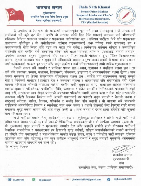 ‘हाम्रो देशको रणनीतिक महत्वका कारणले भूराजनीतिक शक्तिहरूको चासो दिन प्रतिदिन बढिरहेको छ । यद्यपि यो सरकार बनेकै दिनदेखि यसलाई असफल पार्न दक्षिणपन्थी शक्तिहरू विभिन्न प्रकारका चलखेल र षड्यन्त्रमा लागिसकेका छन्’ खनालले भनेका छन् ।