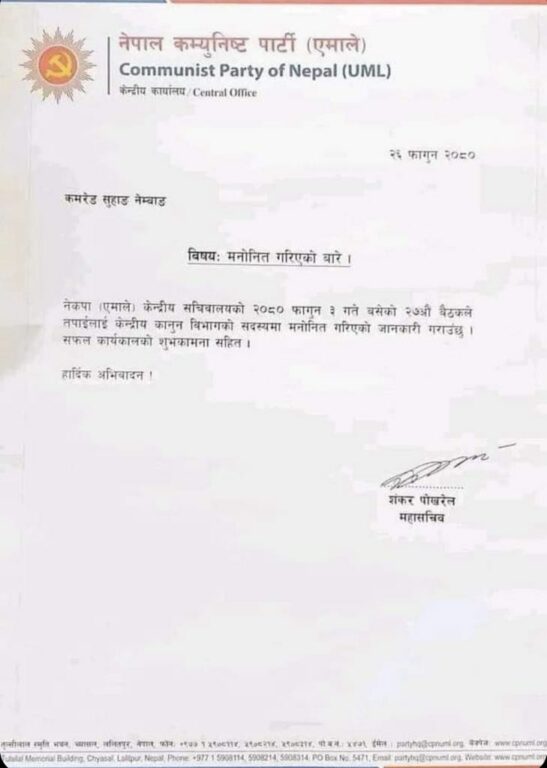 अधिवक्ता समेत रहेका सुहाङलाई महासचिव शंकर पोखरेलले गत फागुन ३ गते बसेको केन्द्रीय सचिवालयको निणर्यबमोजिम पार्टीको केन्द्रीय कानून विभागको सदस्यमा मनोनीत गरेको पत्र थमाएका थिए ।