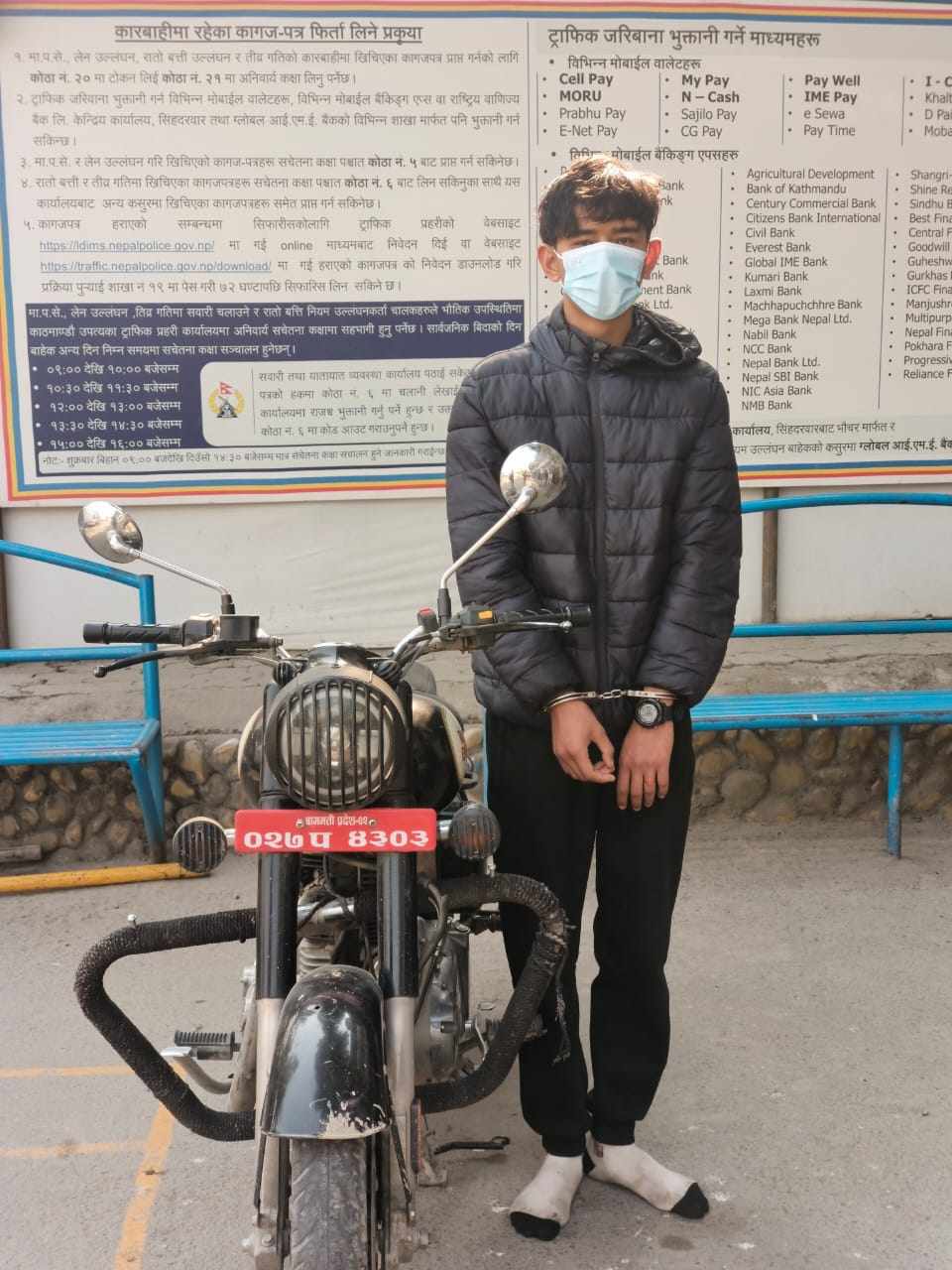 बुढानिकण्ठ नगरपालिका–२ भंगालबाट चोरीको मोटरसाइकलसहित चाबहिल बस्ने १८ वर्षीय सक्षम गुरूङलाई प्रहरीले नियन्त्रणमा लिएको हो ।