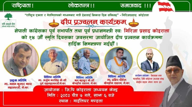 काठमाडौँ । पूर्वप्रधानमन्त्री गिरिजाप्रसाद कोइरालाको १४औं स्मृति दिवसको अवसरमा राजधानीको माइतीघरमा दीप प्रज्वलन गरिएको छ । बुधबार साँझ आयोजित उक्त कार्यक्रममा नेपाली काँग्रेसका नेता कार्यकर्ताको सहभागिता रहेको थियो ।