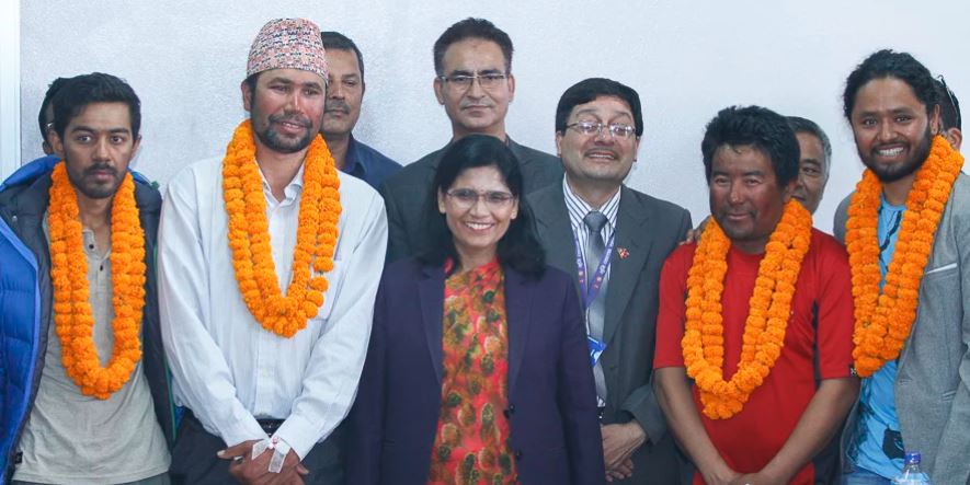 सगरमाथाको चुचुरो पुगेर फर्किएको टोलीलाई मन्त्री अर्याले मन्त्रालयमा शुक्रवार बिहान स्वागत गरेकी थिइन् ।