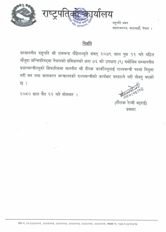 वन तथा वातावरण राज्यमन्त्रीमा दीपक कार्की नियुक्त, शपथको तयारी