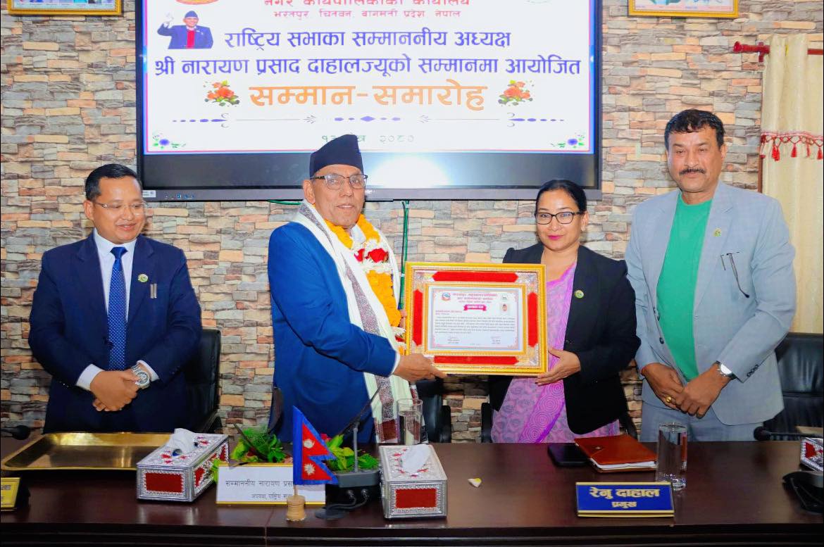 मंगलबार भरतपुर महानगरपालिका सभाहलमा एक कार्यक्रमकाबीच अध्यक्ष दाहाललाई स्वागत तथा सम्मान गरिएको हो ।