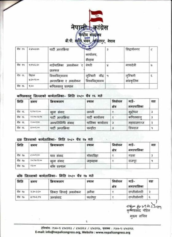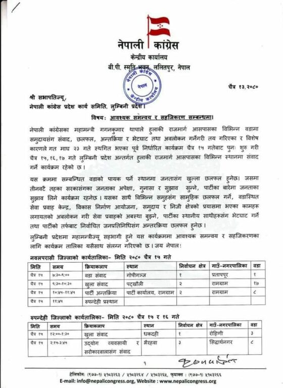 गत माघ २३ मा स्थगित भएको संवाद यात्रा बिहीबार १५ चैत बाट सुरु गर्न लागिएको थापाको सचिवालयले जनाएको छ । ‘पहिला बिबिध कारणवस स्थगित ‘समुदायमा कांग्रेस अभियान’ अन्तर्गत संवाद यात्रामा महामन्त्री गगन कुमार थापाज्यू चैत्र १५, १६ र १७ गते नवलपरासी, रूपन्देही, कपिलवस्तु, दाड र बाँके जिल्लाका कार्यक्रममा सहभागी हुने कार्यक्रम रहेकाले उत्त कार्यक्रममा सहभागिताका लागि सम्बन्धित जिल्लावासी सबैमा हार्दिक अनुरोध गर्दछौ,’ सचिवालयले एक सूचना जारी गर्दै जनाएको छ ।