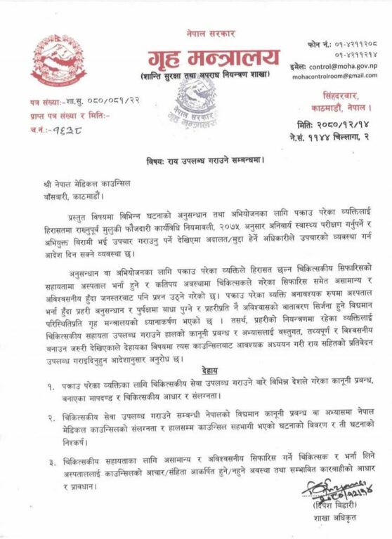 ‘प्रहरीको नियन्त्रणमा रहेका व्यक्तिलाई चिकित्सकीय सहायता उपलब्ध गराउने हालको कानूनी प्रबन्ध र अभ्यासलाई वस्तुगत, तथ्यपूर्ण र विश्वसनीय बनाउन जरुरी देखिएकाले देहायका विषयमा त्यस काउन्सिलबाट आवश्यक अध्ययन गरी रायसहितको प्रतिवेदन उपलब्ध गराइदिनुहुन आदेशानुसार अनुरोध छ ।’ पत्रमा भनिएको छ ।