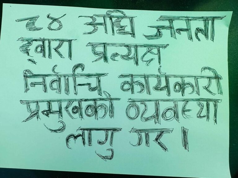 उनले एक्लै उभिएर बोकेको प्ले कार्डमा भनिएको छ, ‘८४ अघि जनताद्वारा प्रत्यक्ष निर्वाचित कार्यकारी प्रमुखको व्यवस्था गर ।’