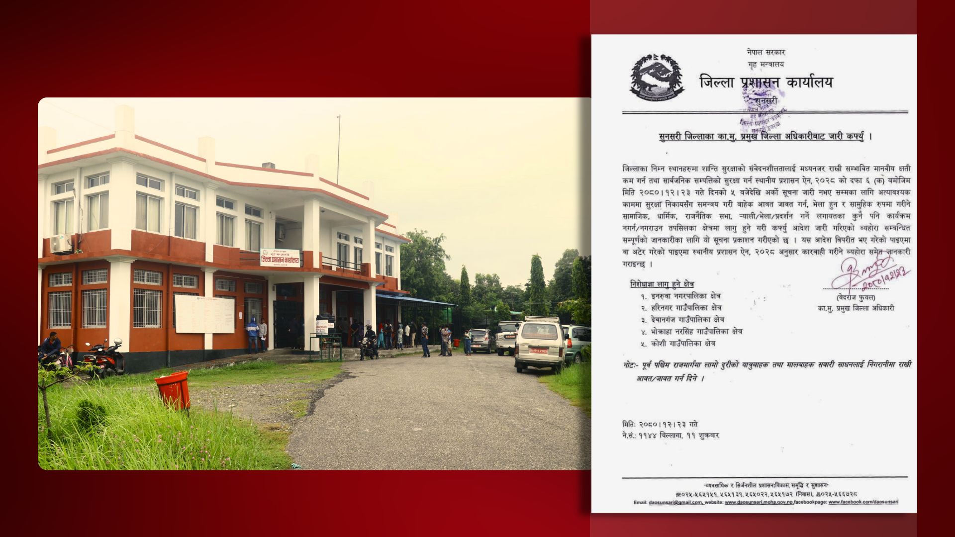 शुक्रबार ५ बजेदेखि अनिश्चित कालका लागि कर्फ्यू आदेश जारी भएको हो । सदरमुकाम रहेको इनरुवा नगरपालिकासहित हरिनगरा, कोशी, भोक्राहा र नरसिंह गाउँपालिकामा स्थानीय प्रशासनले कर्फ्यु जारी गरेको हो।कायममुकायम प्रमुख जिल्ला अधिकारी बेदराज फुयाँलले जारी गरेको आदेशमा अर्को सूचना नभएसम्मका लागि पाँच पालिकामा कर्फ्यू लगाइएको हो ।