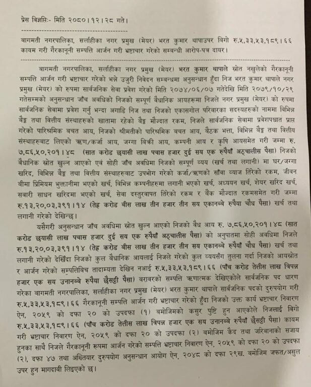 अख्तियार दुरुपयोग अनुसन्धान आयोगले सर्लाहीस्थित बागमती नगरपालिकाका मेयर थापाविरुद्ध गैरकानूनी सम्पत्ति आर्जन गरेको आरोपसहित भ्रष्टाचार मुद्दा दायर गरेको हो ।