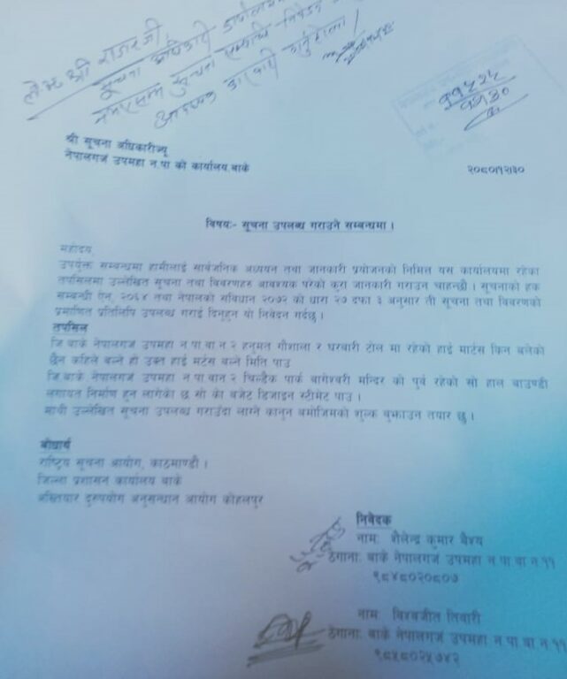 नेपालगन्ज–११ का सूचना अभियन्ता शैलेन्द्रकुमार बैश्य र अधिबक्ता विश्वजित तिवारीले नेपालगन्ज उपमहानगरपालिका कार्यालयसंग आज सूचना माग गर्नुभएको हो । नेपालको संविधान २०७२ को धारा २७ तथा सूचनाको हक सम्वन्धी ऐन २०६४ अनुसार सबैले थाहा पाउने अधिकार अन्र्तगत उक्त सूचना माग गरिएको हो ।