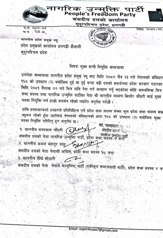नेपाली कांग्रेस संसदीय दलका नेता कमलबहादुर शाह, नागरिक उन्मुक्ति पार्टी संसदीय दलका नेता घनश्याम चौधरी र एकीकृत समाजवादी संसदीय दलका नेता दीर्घ सोडारीको हस्ताक्षरसहित चौधरीले मुख्यमन्त्रीमा दाबी पेश गरेका हुन् ।