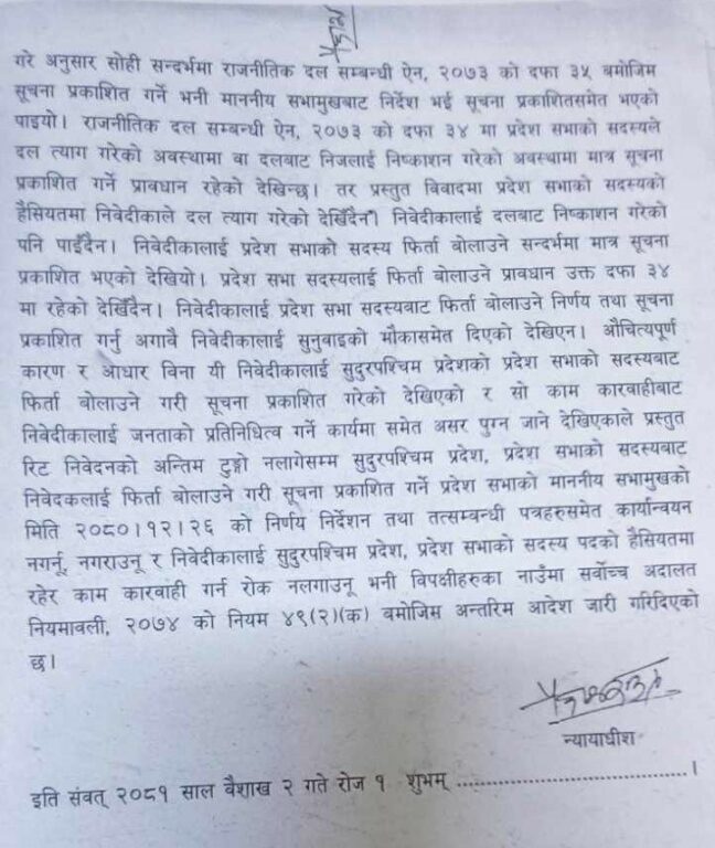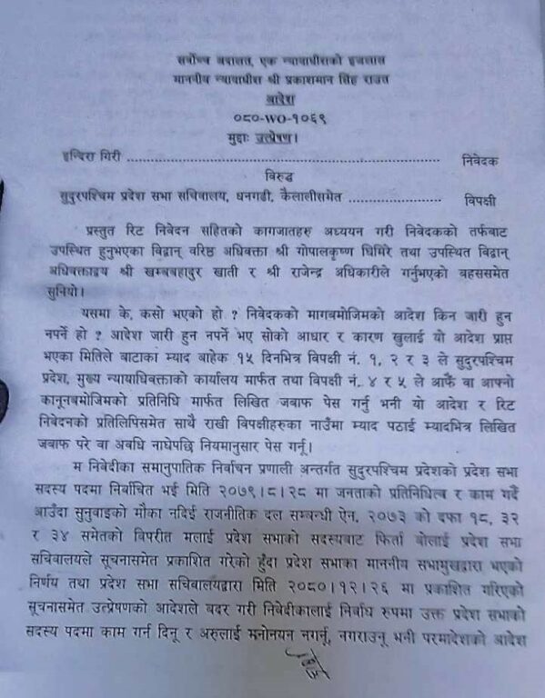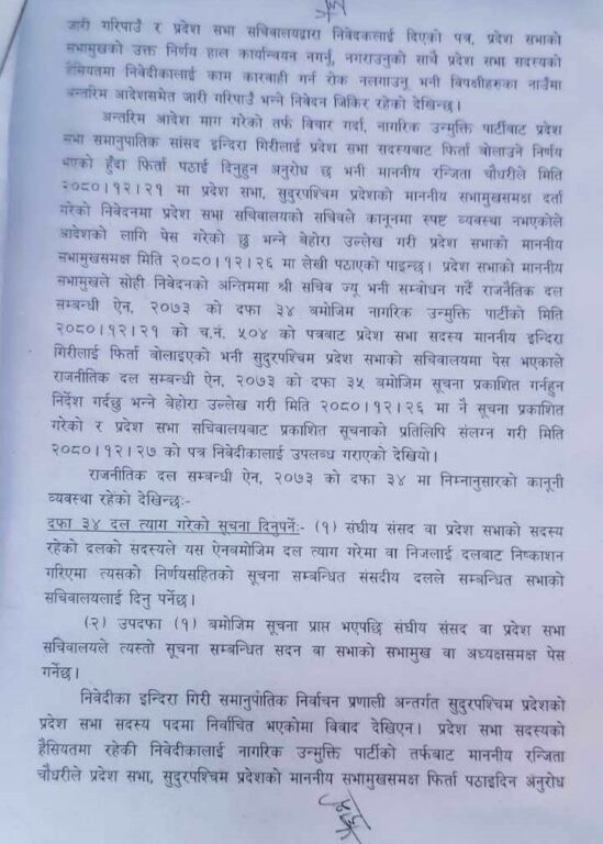 नागरिक उन्मुक्ति पार्टीको सुदूरपश्चिम प्रदेशसभा सदस्यबाट गिरीलाई हटाउने निर्णयविरुद्ध सर्वोच्च अदालतले अन्तरिम आदेश जारी गरेको हो ।