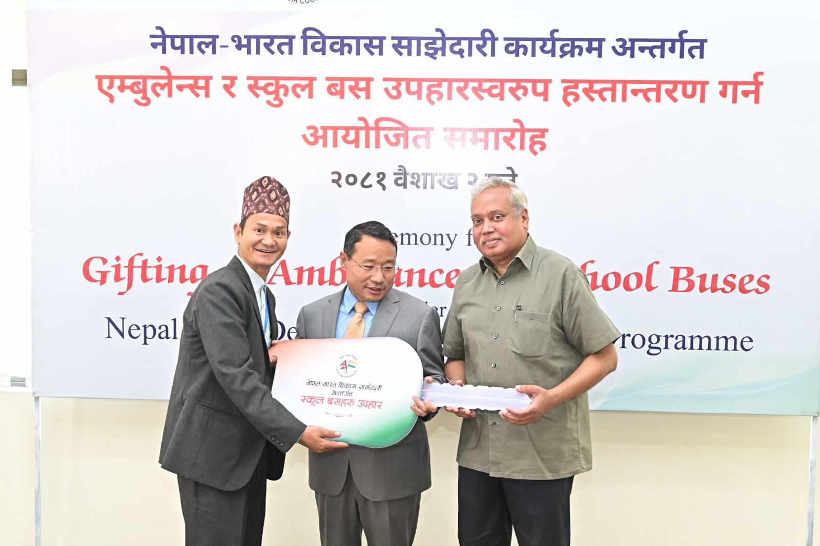 नेपालका लागि भारतीय राजदूत श्री नवीन वास्तवले नेपाल सरकारका अर्थमन्त्री वर्षमान पुनको उपस्थितिमा उक्त एम्बुलेन्स तथा स्कुल बसका चाबी हस्तान्तरण गरेका हुन् ।