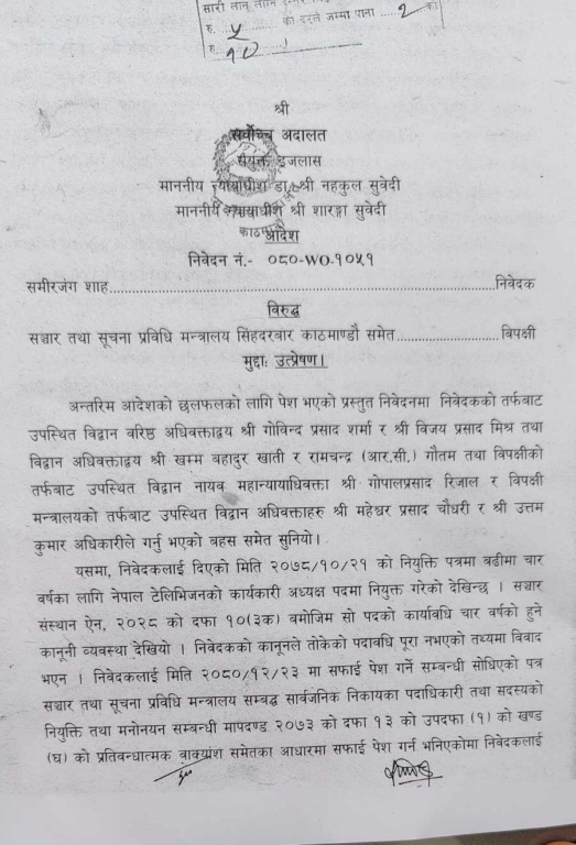 काठमाडौं । गोरखापत्र संस्थानका कार्यकारी अध्यक्ष विष्णु सुवेदी र नेपाल टेलिभिजनका कार्यकारी अध्यक्ष समिरजंग शाहलाई पदबाट नहटाउन सर्वोच्चबाट अन्तरिम आदेश जारी गरेको छ ।