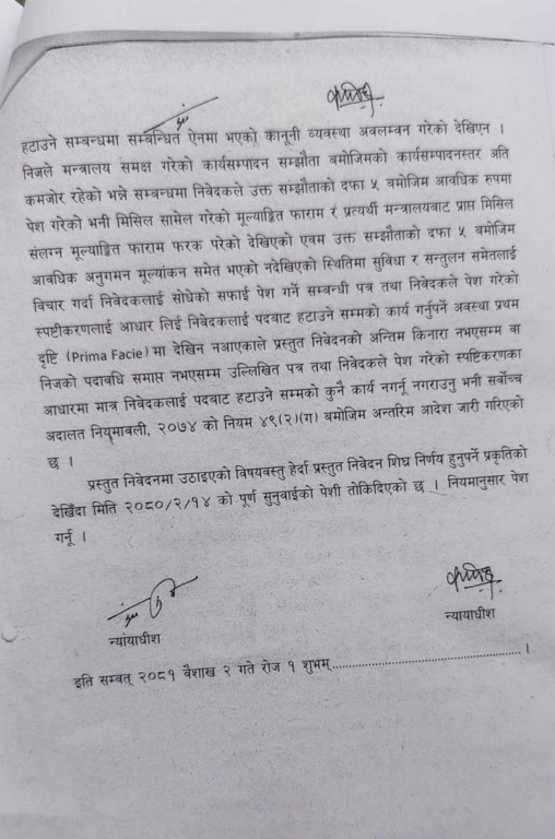 सर्वोच्च अदालतका न्यायाधीशद्वय नहकुल सुवेदी र साराङ्गा सुवेदीको संयुक्त इजालसले सुवेदी र शाहलाई पदबाट नहटाउन अन्तरिम आदेश जारी गरेको हो ।