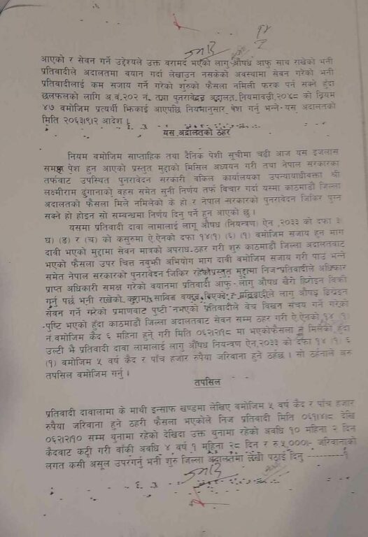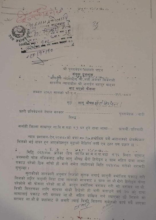 म बाट लागु औषध वरामद भएको होइन मेरो साथी नविन लामा वनस्थलिमा खाजा खान गएको थिएँ । निजसँग लागु औषध खैरो हेरोईनको प्याकेट रहेछ । उक्त कुरा थाहा पाई प्रहरी त्यहाँ आई निजलाई पक्राउ गरी लागु औषध वरामद गरी निजलाई कुटपिट गरि छाडी दिए र मलाई समाते । प्रहरी समक्ष गरेको बयान मेरो होइन । जबरजस्ती झुठा व्यहोरा लेखिएको कागजमा सहीछाप गराएका हुन् । मलाई पढ्न समेत दिइएन । लागु औषध कारोबारमा मेरो कुनै संलग्नता नै नभएको हुँदा मलाई सजाय हुनु पर्ने होइन ।