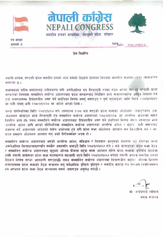 आज दिउँसो ३ बजेदेखि बस्ने गरी प्रदेश प्रमुखले बैठक आह्वान गरेका थिए, तर बैठक बहिस्कार गर्ने भन्दै कांग्रेसले बैठकको निर्णयसहित सभामुख कृष्ण धिताललाई ज्ञापनपत्र बुझाएको छ ।