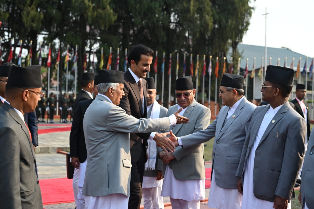 काठमाडौं । २० घन्टा नेपाल रहनेगरी काठमाडौं उत्रिएका कतारका अमिर (राजा)शेख तमिम बिन हमाद अल थानीलाई राष्ट्रपति रामचन्द्र पौडेल र उपप्रधानमन्त्री तथा परराष्ट्रमन्त्री नारायणकाजी श्रेष्ठले विमानस्थलमा स्वागत गरेका छन ।