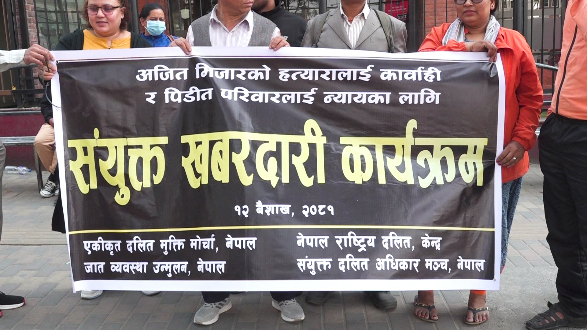 बुधबार एकीकृत दलित मुक्ति मोर्चा नेपाल, जात व्यवस्था उन्मूलन नेपाल, नेपाल राष्ट्रिय दलित केन्द्र र संयुक्त दलित अधिकार मञ्चले काठमाडौंको माइतीघरमा मिजारको हत्यारामा संलग्नलाई कारबाही र पीडित परिवारलाई न्यायका संयुक्त प्रदर्शन गरेका हुन् ।