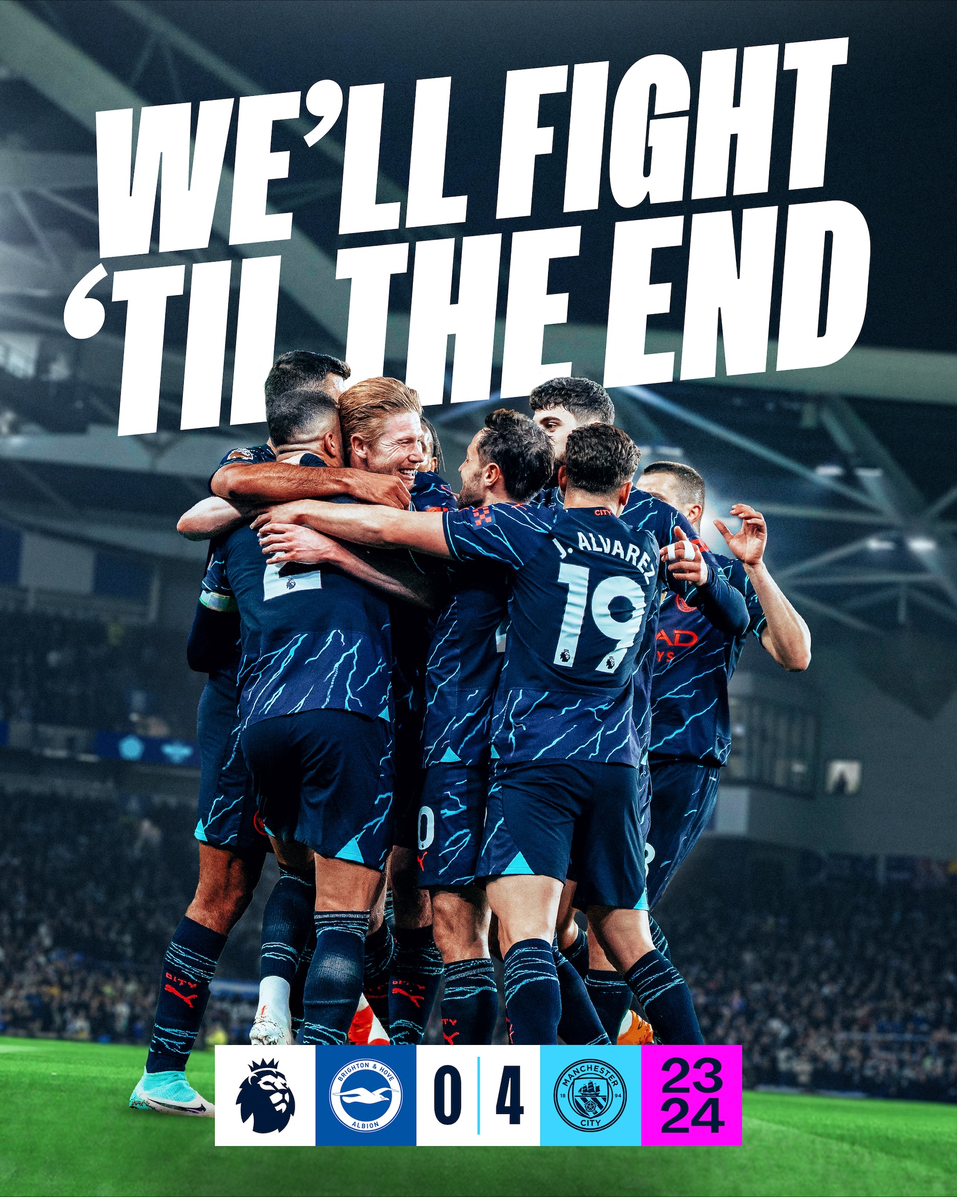 ६२ औं मिनेटमा वाल्करको पासमा अल्भारेजले गोल गरेपछि सिटी ४–० को सहज र एकतर्फी जित निकाल्दै स्पष्ट ३ अंक थप गर्न सफल भयो । सिटीको जितसँगै प्रिमियर लिगको उपाधि होड तीन टोलीका बीचमा केन्द्रीत भएको छ । पराजित भएको ब्राइटन भने ४४ अंकका साथ तालिकाको ११ औं स्थानमा छ ।