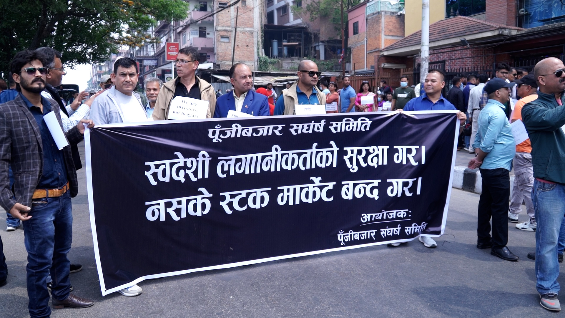 आन्दोलनमा सहभागीहरुले ‘हामी लगानीकर्ता हौं, भिखारी होइनौं’,‘मैलिक हक अधिकारको सुरक्षा गर’,‘लगानी क्याम्प खारेज गर’, ‘लगानीकर्तालाई विदेश पलायन गर्ने कार्य बन्द गर’ लगायतका प्ले कार्ड बोकेर प्रदर्शन गरेका हुन् ।