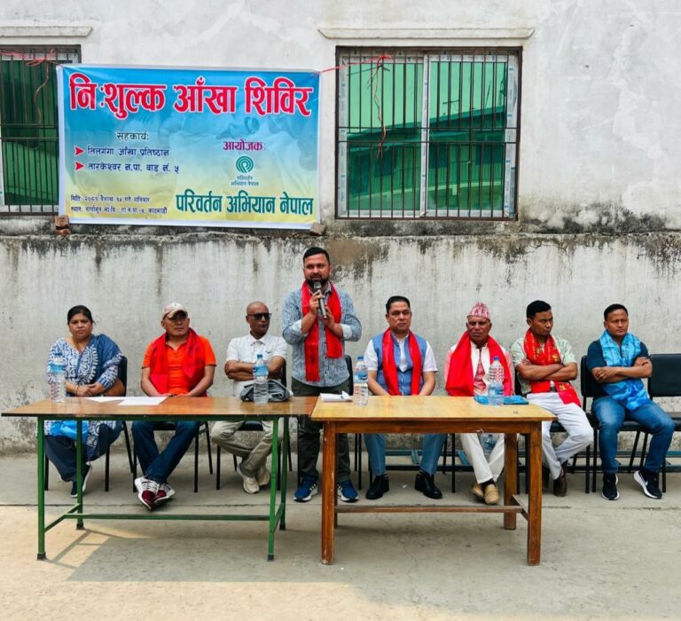 काठमाडौं। काठमाडौंको तारकेश्वरमा शनिवार निःशुल्क आँखा शिविर सम्पन्न गरिएको छ । परिवर्तन अभियान नेपालद्वारा आयोजित शिविरमा स्थानीय ६१० जनाको निःशुल्क आँखाको परीक्षण परिएको अध्यक्ष सुशील भट्टले जानकारी दिए ।