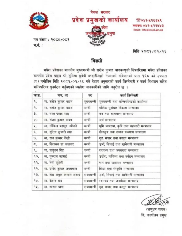 मधेस प्रदेशमा १५ सदस्यीय मन्त्रिमण्डल विस्तार