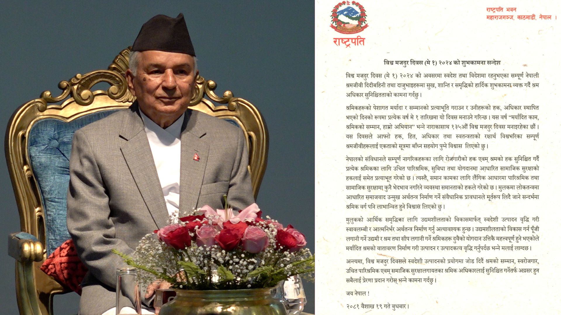 बुधबार विश्व मजदुर दिवस, २०२४ को अवसरमा एक सन्देश जारी गर्दै राष्ट्रपति पौडेलले देशको आर्थिक समृद्धि र आत्मनिर्भरउन्मुख अर्थतन्त्र निर्माणमा जोड दिँदै मर्यादित श्रमको वातावरण निर्माण गरी उत्पादन र उत्पादकत्व वृद्धि गर्नुपर्ने बताएका हुन् ।