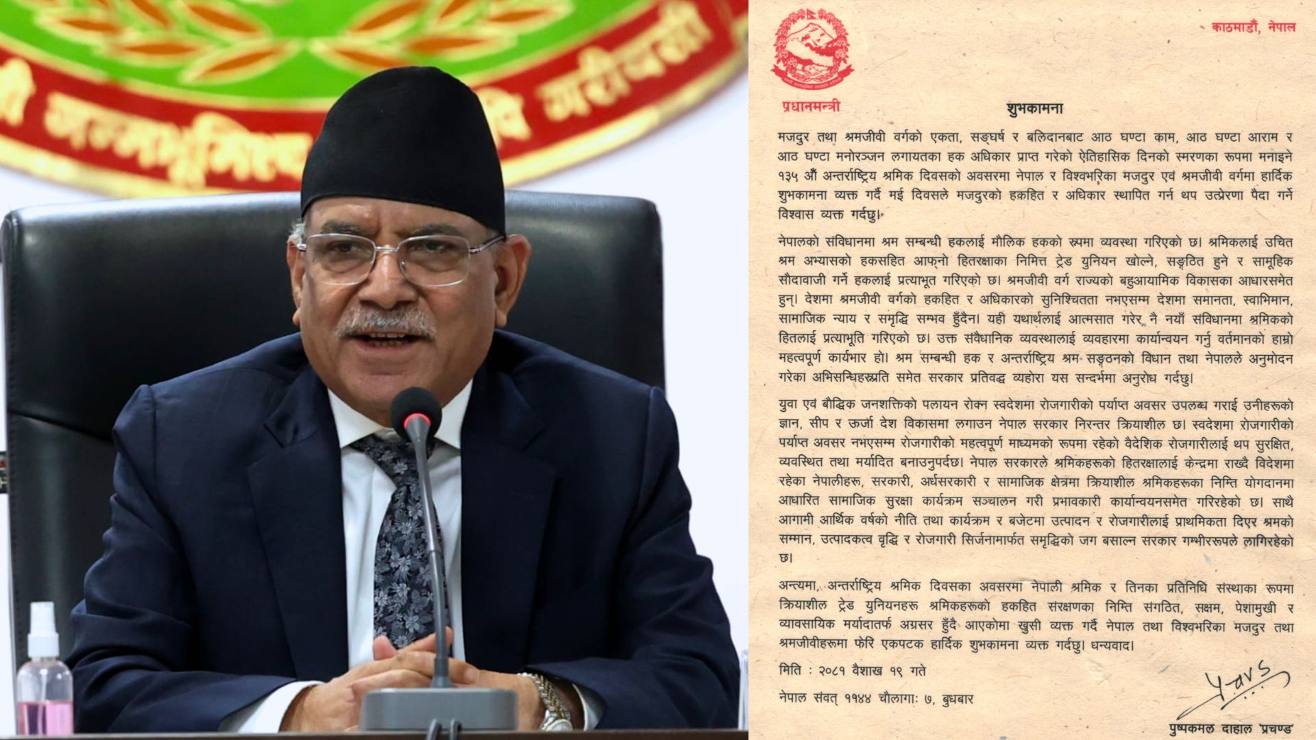 बुधबार विश्व श्रमिक दिवस, २०२४ का अवसरमा शुभकामना दिदै दाहालले श्रमिकको हितलाई केन्द्रमा राखेर विदेशमा रहेका नेपाली, सरकारी, अर्धसरकारी र सामाजिक क्षेत्रमा क्रियाशील श्रमिकका निम्ति योगदानमा आधारित सामाजिक सुरक्षा कार्यक्रम सञ्चालन गरिएको उल्लेख गरेका छन् ।