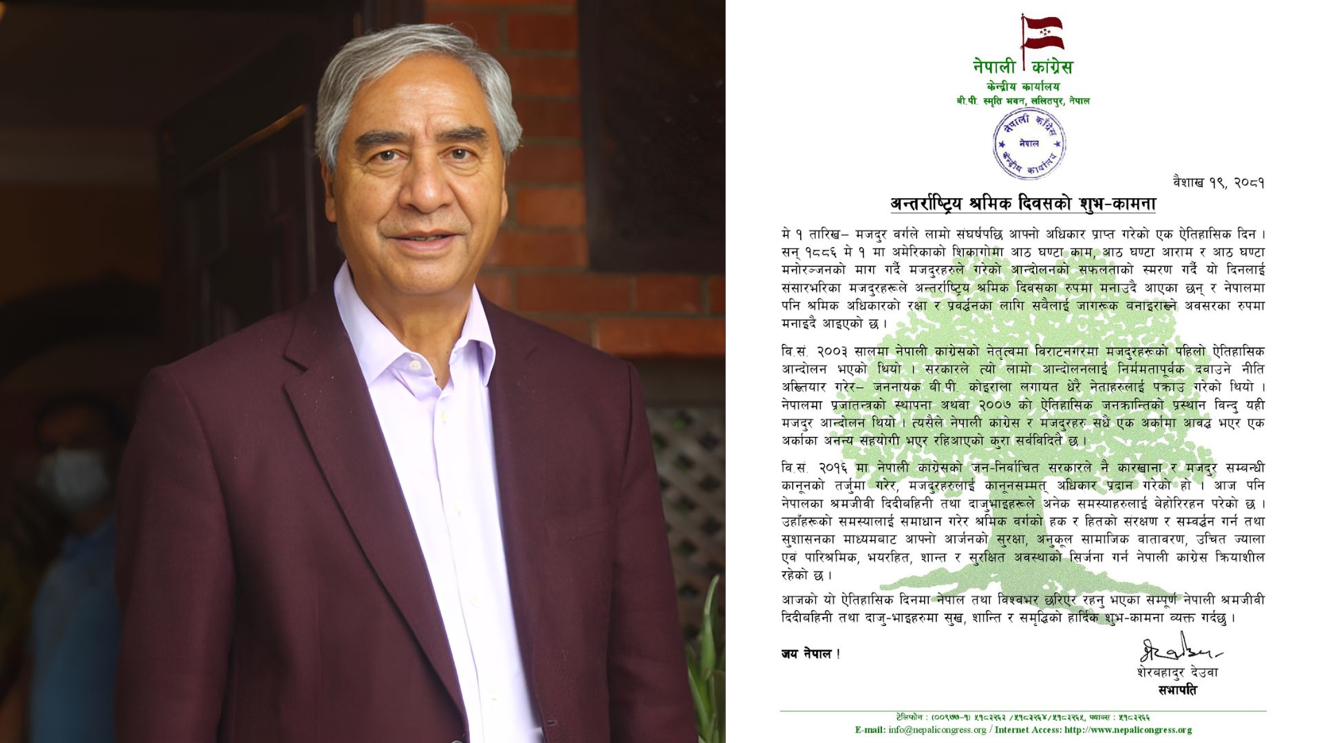 बुधबार अन्तर्राष्ट्रिय श्रमिक दिवसको सन्दर्भमा शुभकामना सन्देश जारी गर्दै सभापति देउवाले नेपालमा वि.सं. २०१६ मा नेपाली कांग्रेसको जन–निर्वाचित सरकारले नै कारखाना र मजदुर सम्बन्धी कानूनको तर्जुमा गरेर, मजदुरहरुलाई कानूनसम्मत् अधिकार प्रदान गरेको स्मरण गरेका छन् । ‘आज पनि नेपालका श्रमजीवी दिदीबहिनी तथा दाजुभाइहरूले अनेक समस्याहरुलाई बेहोरिरहन परेको छ । उहाँहरूको समस्यालाई समाधान गरेर श्रमिक वर्गको हक र हितको संरक्षण र सम्वद्र्धन गर्न तथा सुशासनका माध्यमबाट आफ्नो आर्जनको सुरक्षा, अनुकूल सामाजिक वातावरण, उचित ज्याला एवं पारिश्रमिक, भयरहित, शान्त र सुरक्षित अवस्थाको सिर्जना गर्न नेपाली कांग्रेस क्रियाशील रहेको छ,’ देउवाको भनाइ छ ।